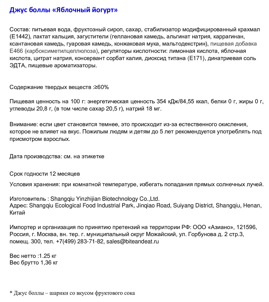 Желейные шарики для бабл ти со съедобной оболочкой и соком яблоко-йогурт внутри, являются неотъемлемым компонентом бабл-ти, придавая напитку изысканность и замечательную фруктовую свежесть. Лопающиеся жемчужины с тонкой желеобразной оболочкой и насыщенной кисло-сладкой начинкой из сока яблоко-йогурт, обеспечивают неповторимые вкусовые ощущения и надолго запоминающийся бабл ти.