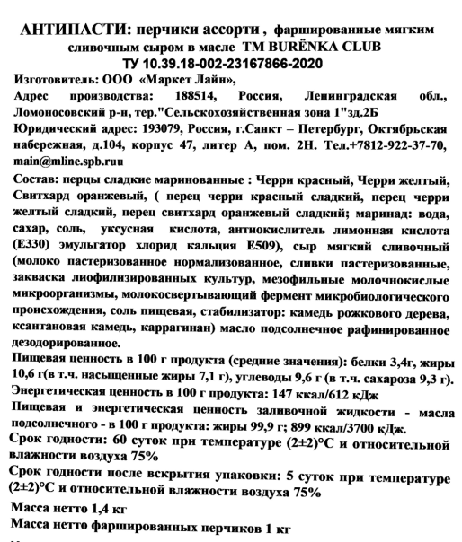 Перцы сладкие маринованные: Черри красный, Черри желтый, Свитхард оранжевый, перец черри красный сладкий, перец черри желтый сладкий, перец свитхард оранжевый сладкий, маринад: вода, сахар, соль, уксусная кислота, антиокислитель лимонная кислота Е30 эмульгатор хлорид кальция Е509, сыр мягкий сливочный молоко пастеризованное нормализованное, сливки пастеризованные, закваска лиофилизированных культур, мезофильные молочнокислых микроорганизмы, молокосвертывающий фермент микробиологического происхождения, соль пищевая, стабилизатор: камедь рожкового дерева, ксантановая камедь, каррагинан масло подсолнечное рафинированное дезодорированное, смесь сушеных трав и овощей тимьян, майоран, чабер, базилик, орегано, розмарин, шалфей, мята, паприка красная, паприка зеленая, перец сушеный горошком белый, красный, черный, зеленый и душистый перец.
