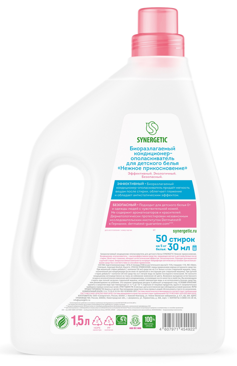 Биоразлагаемый кондиционер-ополаскиватель для детского белья Synergetic Нежное прикосновение - высокоэффективное средство, придающее мягкость детскому белью после стирки, облегчает глажение, обладает антистатическим эффектом. Гипоаллергенный кондиционер-ополаскиватель нейтрализует остатки средств для стирки на ткани, сохраняет структуру ткани, защищая волокна от изнашивания и повреждения. Подходит для ручной и машинной стирки. Кондиционер подходит для детского белья 0+ и одежды людей с чувствительной кожей. Не содержит ароматизаторов и красителей. Международный экологический сертификат ICEA подтверждает биоразлагаемость, безопасность и эффективность средства. Дерматологически протестирован независимым институтом Dermatest в Германии. Биоразлагаемые компоненты не вредят микрофлоре септических установок при использовании средства в соответствии со способом применения. Кондиционер имеет экомаркировку Листок жизни. Этот знак на упаковке - гарантия экологической безопасности продукта для человека и окружающей среды.