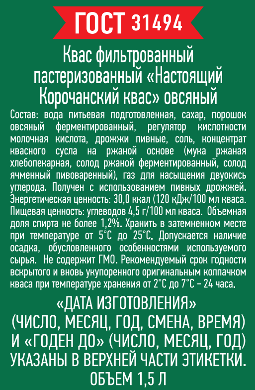 Квас Корочанский настоящий квас Овсяный. Овсяный квас - это кислый прохладительный напиток, приготовленный методом живого брожения.