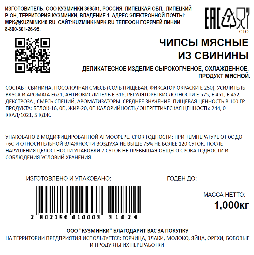 Чипсы мясные Кузминки из свинины сырокопченые, ~100-150г