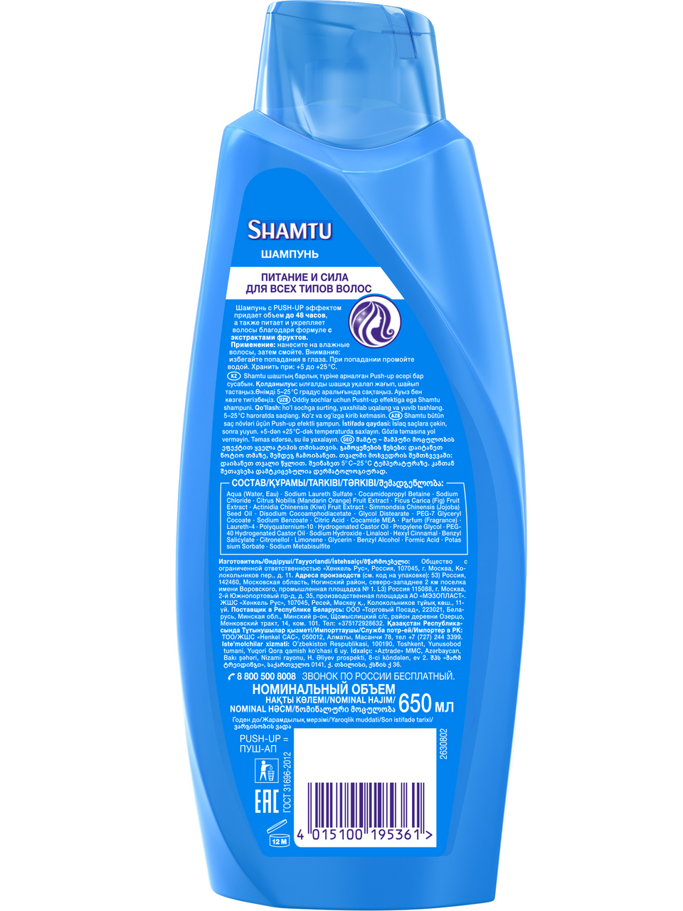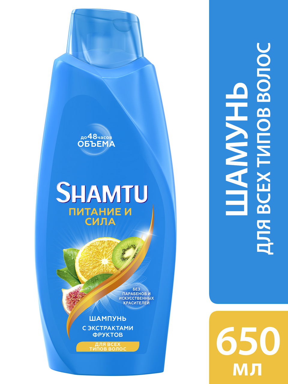 Shamtu Шампунь Питание и Сила с экстрактами фруктов: Шампунь с Push-up эффектом придает объем до 48 часов. Питает и укрепляет волосы благодаря формуле с экстрактами фруктов. Для всех типов волос. Без парабенов и искусственных красителей!