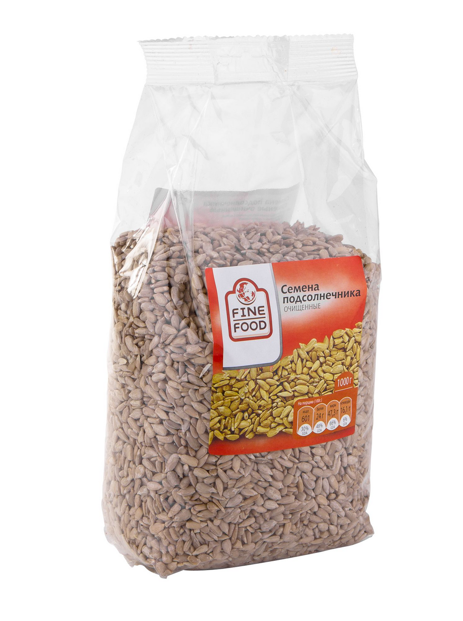 Семена подсолнечника Fine Food, 1000 г. Под кожурой подсолнечного семени скрывается множество питательных веществ, полезных элементов и витаминов: белки, жиры, углеводы, натуральные сахара, витамины С, D, Е и группы В, каротин; минералы – железо, фосфор, натрий, магний, кальций, калий. Пищевая ценность 100 г: белки – 24,0 г, жиры – 47,3 г, углеводы – 16,1 г; энергетическая ценность – 601 ккал. Хранить при температуре не выше +20C и относительной влажности воздуха не более 70%. Годен 12 месяцев от даты изготовления и упаковывания. Продукт противопоказан при индивидуальной непереносимости.