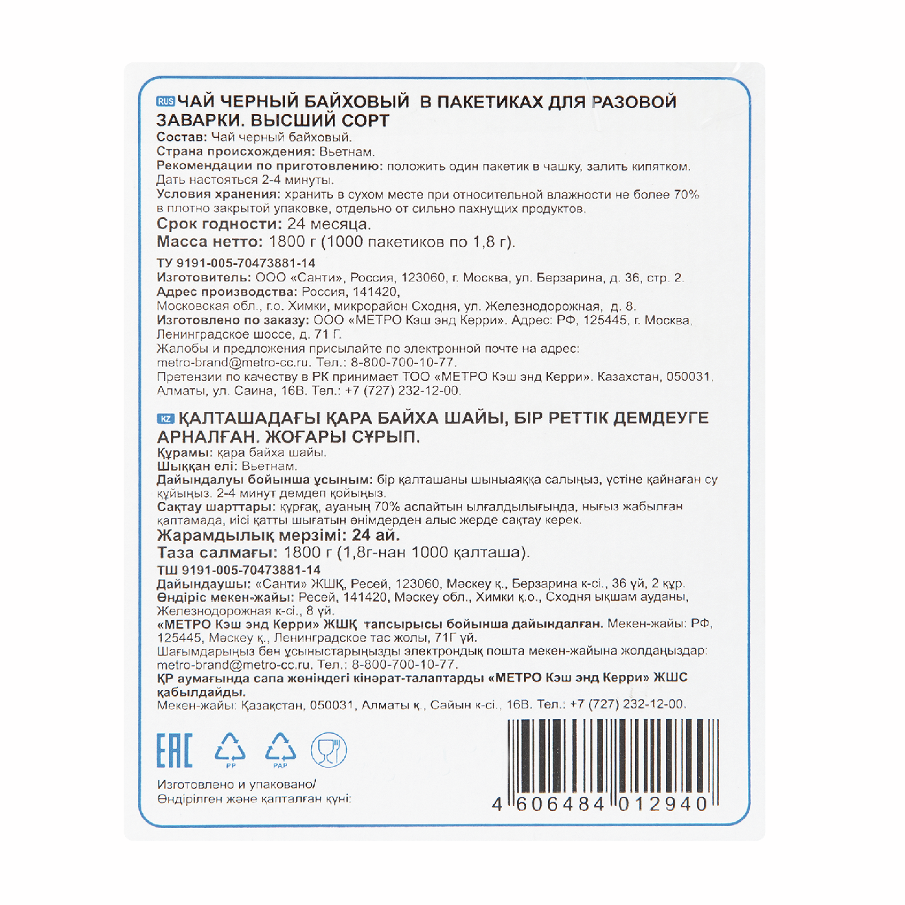 aro Чай черный пакетированный (1.8г х 1000шт), 1.8кг