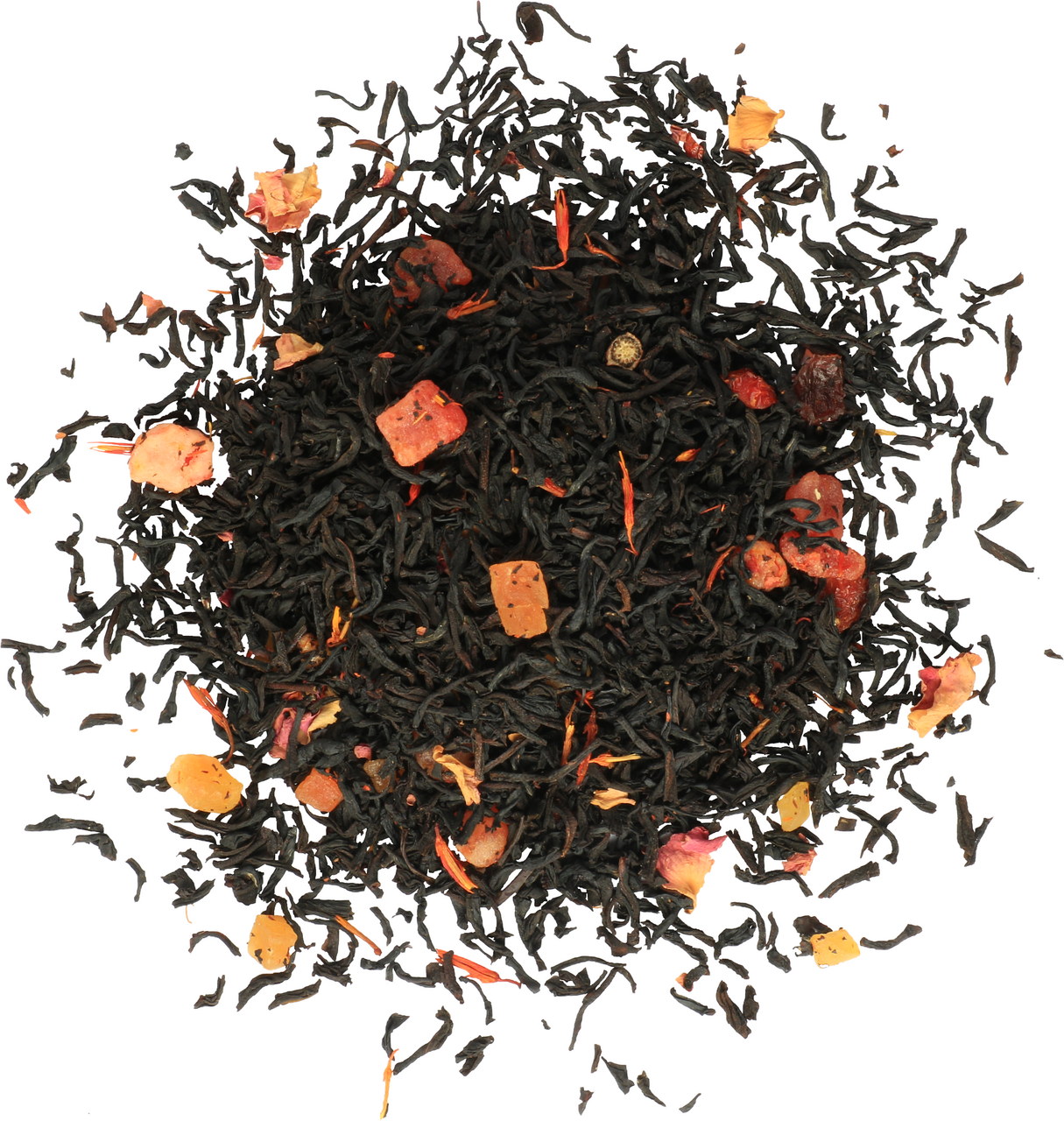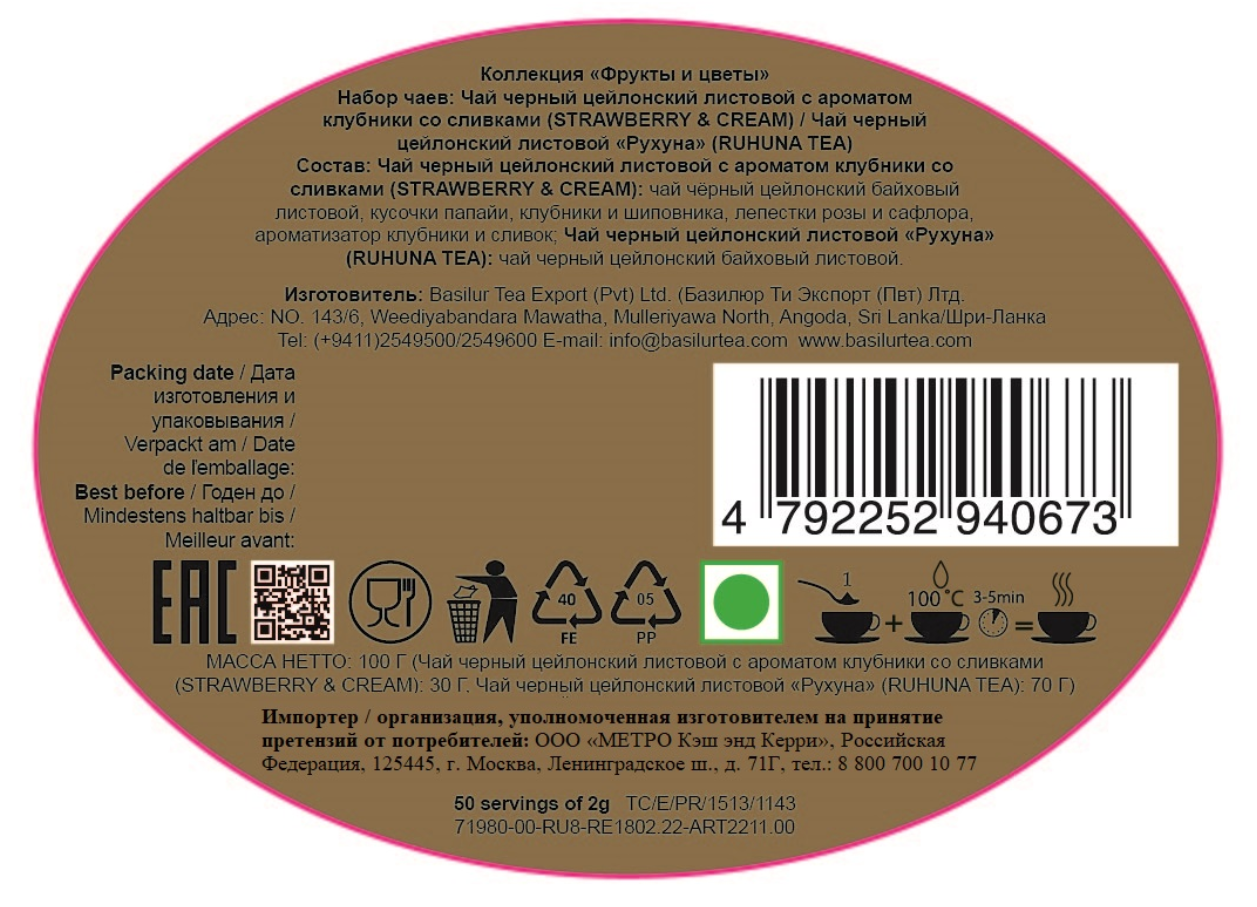 Чай черный цейлонский байховый листовой, кусочки папайи, клубники и шиповника, лепестки розы и сафлора, ароматизатор клубники и сливок.