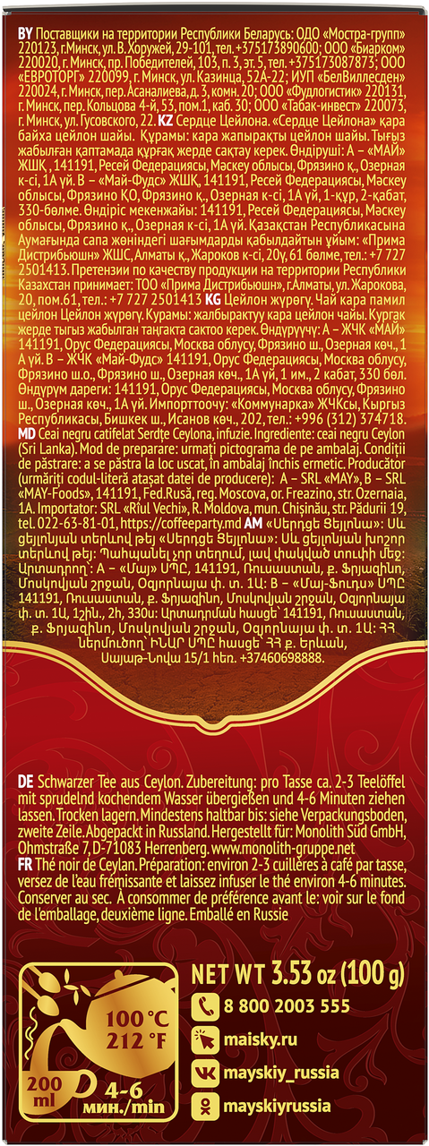 Чай Майский черный Сердце Цейлона, 100 г обладает глубоким и ярким вкусом. В нем присутствуют едва заметные нотки и печеного яблока, которые появляются в результате ферментации. Так крупные листочки, собранные на лучших цейлонских плантациях, получают свои уникальные вкусовые качества и неповторимый аромат. Чтобы заслужить название байховый, необходимо использовать исключительно молодые зеленые листья. Именно так поступает производитель. Благодаря бережному отношению к сырью удается максимально сохранить полезные свойства растения. Именно в молоденьких листочках содержится больше всего витаминов и микроэлементов. Готовый напиток обладает насыщенным бордовым оттенком. Чай Майский можно приобрести для дома, офиса, предпри��тий общественного питания и т. д. Заваривать чай можно в чашке или в заварочном чайнике. В последнем случае чтобы получить достаточно крепкий напиток, можно использовать несколько пакетиков. Предварительно посуду следует обдать кипятком. Его же используют для заваривания. Чашку следует накрыть крышкой и оставить для настаивания на несколько минут. Горячий бодрящий напиток хорошо освежает и заряжает энергией. Легкий завтрак с бутербродами – отличное начало дня. Чашка чая поддержит силы на работе и поможет снять усталость после трудового дня. Его можно подавать соло. С ним отлично сочетаются любые сладости и десерты. В качестве подсластителя обычно используют сахар и другие подсластитель (сахарозаменители, сиропы, мед). Разнообразить вкус поможе�� молоко, долька лимона, кусочки сушеных или свежих фруктов и ягод. Любители необычных сочетаний могут поэкспериментировать с пряностями и специями.