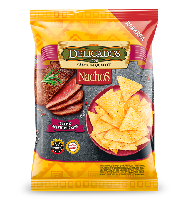 Насладись аутентичными мексиканскими Delicados Nachos с разнообразными вкусами и наполни свою жизнь яркими, позитивными эмоциями! Чипсы Delicados Nachos изготовлены из 100% натурального зерна кукурузы, сваренного по особой технологии и размолотого каменными жерновами, с обжаркой на высокоолеиновом подсолнечном масле. Такой способ производства придает нашим хрустящим чипсам особый вкус! В новой линейке Delicados Nachos ощути многообразие Аргентинского танго вместе со вкусом Стейк аргентинский - это насыщенный вкус ароматного мяса прожаренного на углях. Яркое ощущение красок латиноамериканской кухни.