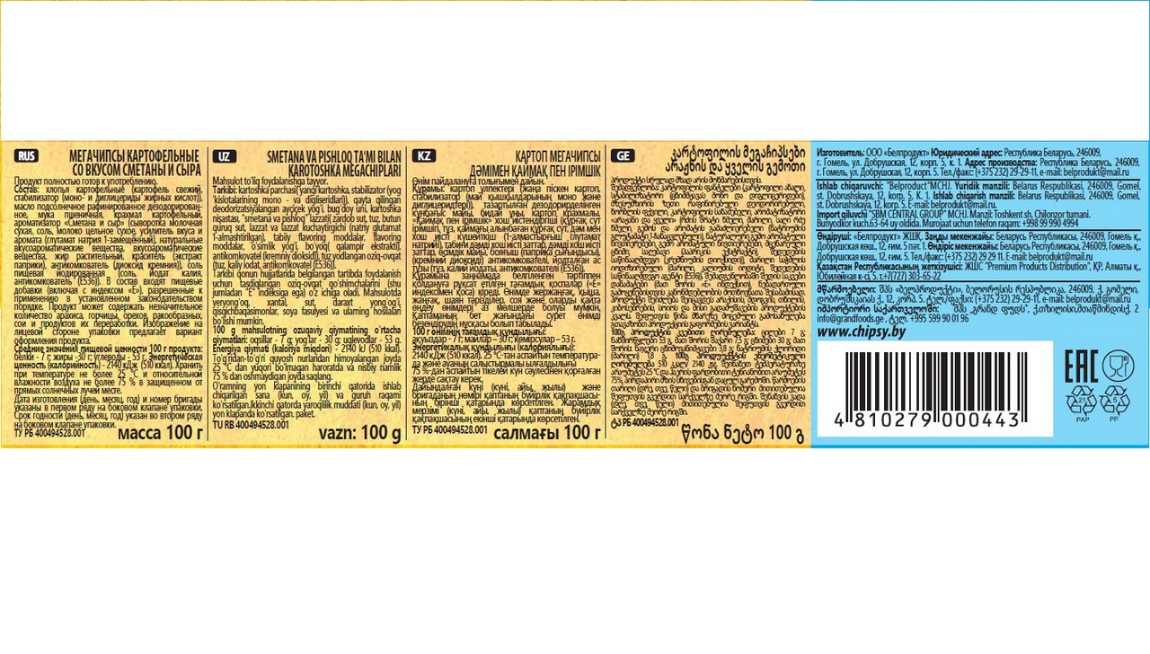 Мегачипсы тонкие, хрустящие и ароматные пластинки торговой марки Megachips отлично подходят в качестве сухого завтрака, закуски к напиткам и гарнира к различным блюдам. При производстве мега чипсов в процессе жарки используется только высококачественное рафинированное дезодорированное растительное масло глубокой очистки. Чипсы упаковываются в металлизированную пленку и картонную коробочку. Вкусные, хрустящие картофельные чипсы из Беларуси.