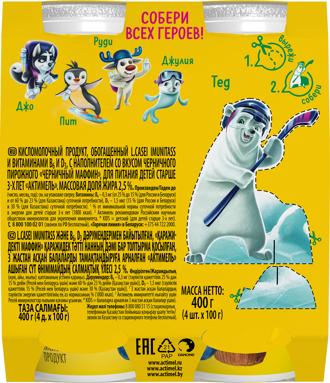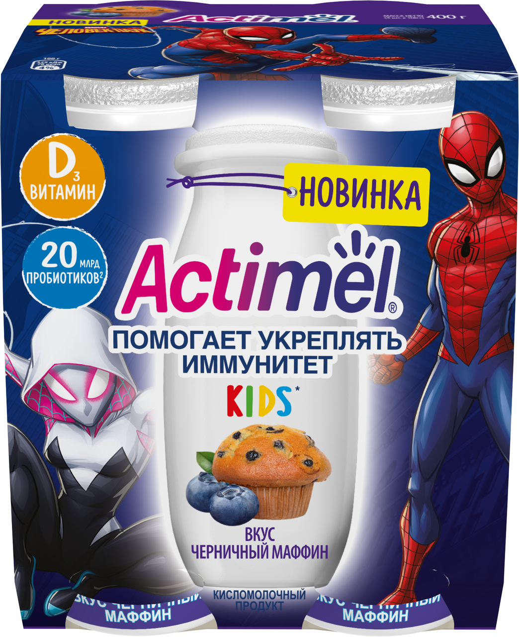 Напиток кисломолочный Actimel детский со вкусом черничного маффина 2.5%, 100г БЗМЖ – большая польза! В одной бутылочке Актимель - целых 20 млрд пробиотиков L.Casei Imunitass , витамины B6 и D3.Будь сильнее вместе с Актимель.Укрепляй иммунитет каждый день.