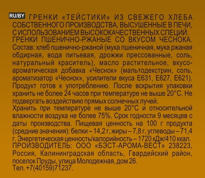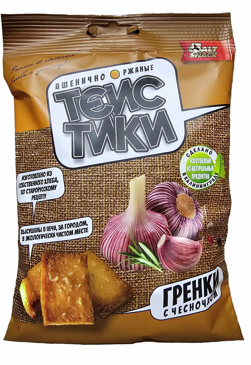 Гренки Тейстики произведены в Калининградской области из хлеба собственного производства. Для производства хлеба берутся только натуральные ингредиенты: мука пшеничная 1 сорт, мука ржаная обдирная, вода питьевая, живые дрожжи, соль, солод. Для придания вкуса и аромата продукции, используются лучшие специи и ароматические добавки. Отлично подойдут для легкого и полезного перекуса. Продукцию можно использовать как дополн��тельный ингредиент в кулинарных изделиях: овощных и мясных салатах, супах и бульонах. Изготовлены из собственного хлеба по старорусскому рецепту. Хрустящие аппетитные сухарики обладают насыщенным чесночным ароматом.