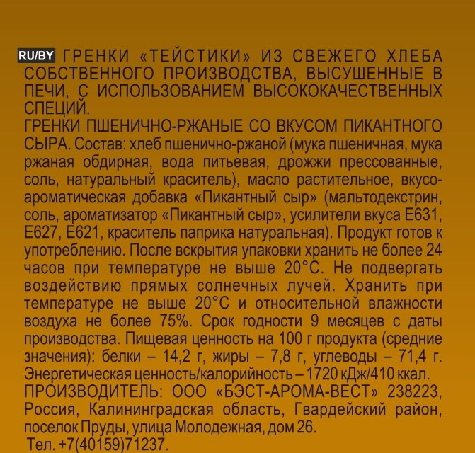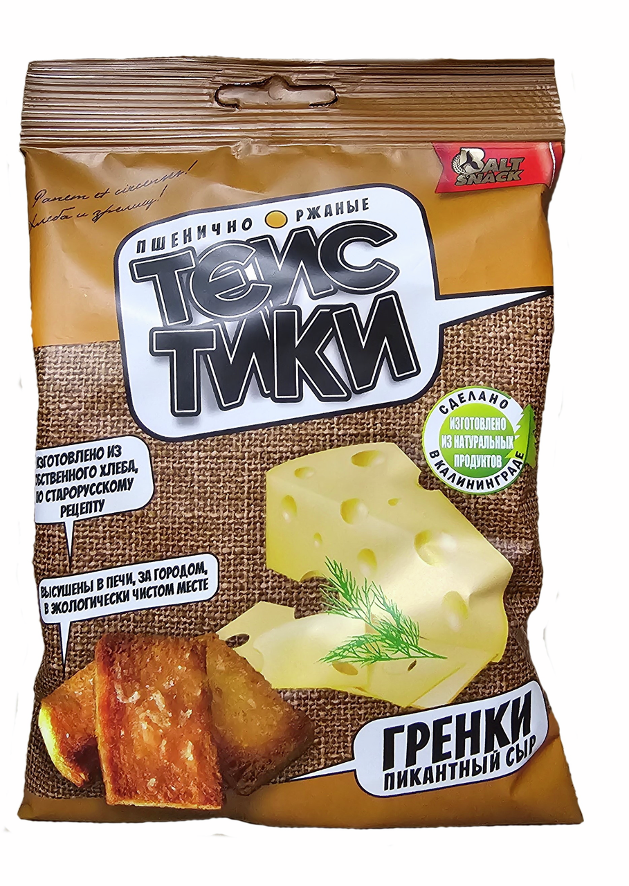 Гренки Тейстики произведены в Калининградской области из хлеба собственного производства. Для производства хлеба берутся только натуральные ингредиенты: мука пшеничная 1 сорт, мука ржаная обдирная, вода питьевая, живые дрожжи, соль, солод. Для придания вкуса и аромата продукции, используются лучшие специи и ароматические добавки. Отлично подойдут для легкого и полезного перекуса. Продукцию можно использовать как дополнительный ингредиент в кулинарных изделиях: овощных и мясных салатах, супах и бульонах. Это вкусный и сытный перекус, который подойдет для любителей сырного вкуса.