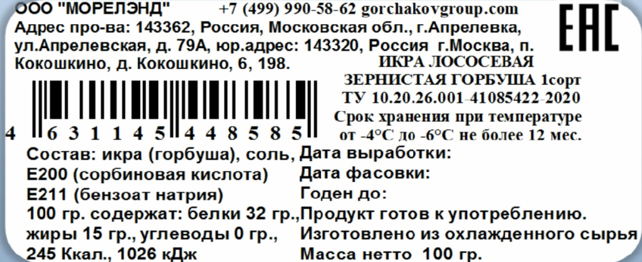 Икра (горбуша), соль, Е200 (сорбиновая кислота), Е211 (бензоат натрия).