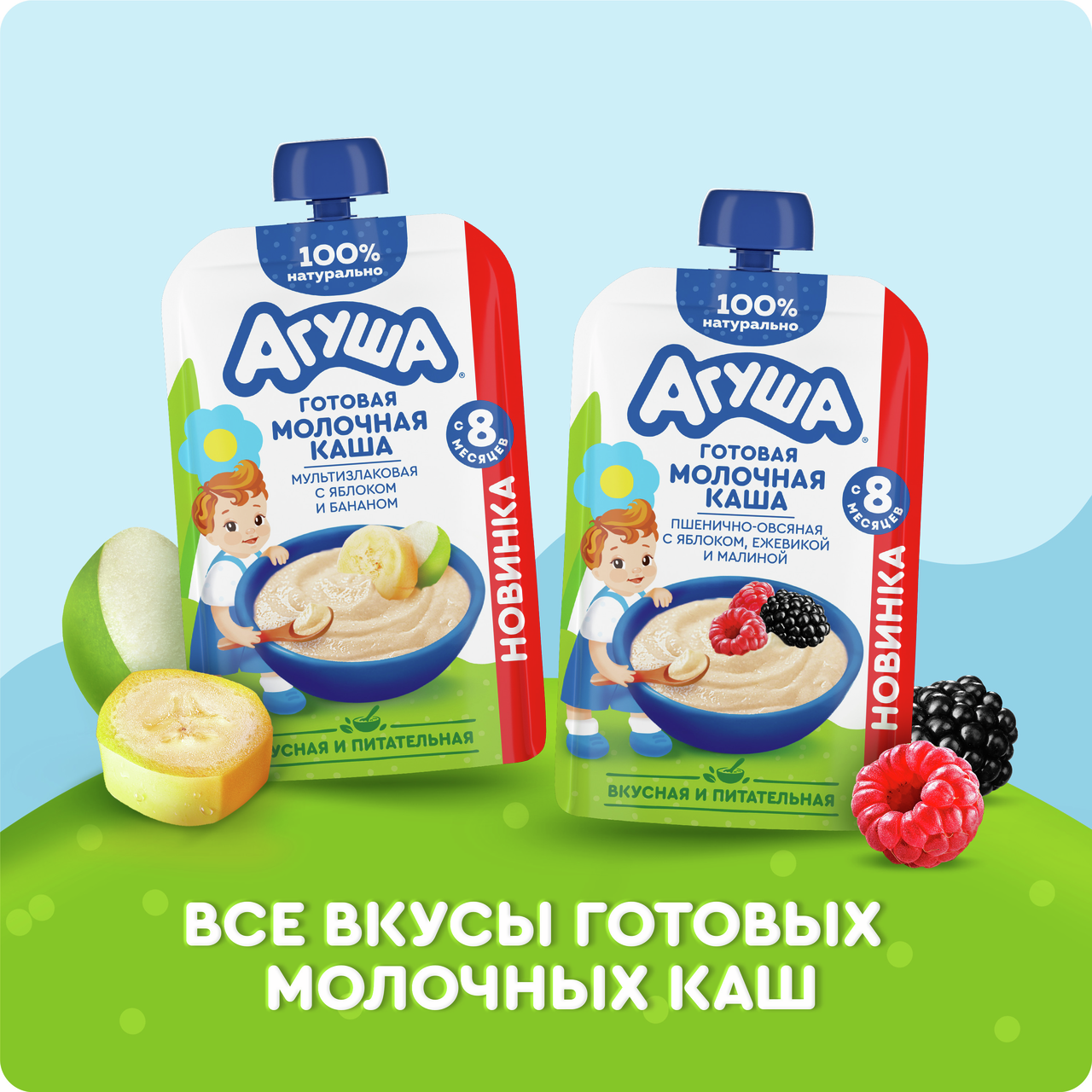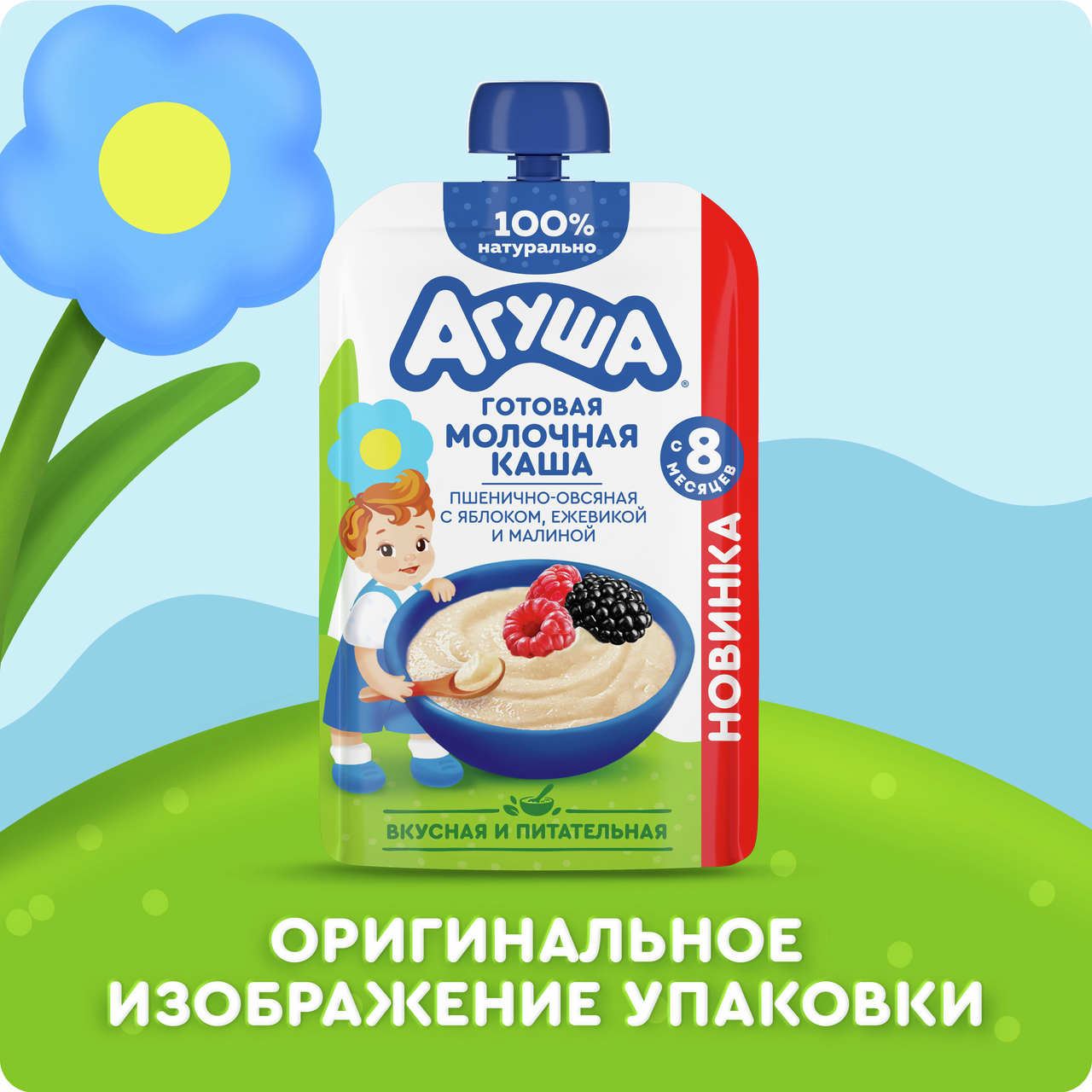 Новинка от Агуши для детей с 8 месяцев - детская готовая молочная каша без варки. Вкусная, питательная 100% натуральная пшенично-овсяная каша с овсяными хлопьями, яблоком, ежевикой, малиной и без добавления консервантов имеет высокое содержание молока и злаков. Технологический процесс имитирует приготовление каш в домашних условиях. Правильная густая консистенция позволяет легко есть из мягкой упаковки. Эту кашу Агуша удобно брать с собой.