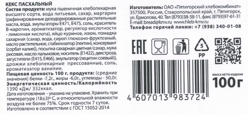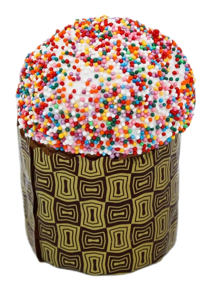 Мука пшеничная хлебопекарная высшего сорта, вода питьевая, сахар, маргарин (рафинированные дезодорированные растительные масла, вода, эмульгаторы E471, E475, соль, краситель В-каротин, ароматизатор, регулятор кислотности - лимонная кислота), яйцо куриное, изюм, помадка сахарная (сахар, вода, сироп глюкозно-фруктозный, масло растительное, стабилизатор (пектин), консервант (сорбат калия)), посыпка сахарная цветная (сахар, мука рисовая, масло пальмовое, краситель (E1422), декстроза, загустители (E415,E466), эмульгатор (лецитин соевый)), дрожжи хлебопекарные прессованные, соль, ароматизатор ванилин.
