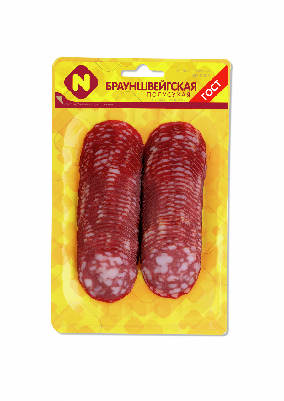 Колбаса Брауншвейгская ГОСТ сырокопченая ОСТАНКИНО , 100 г приготовлена из отборной говядины и свинины с использованием уникальной технологии копчения. Изысканные пряности, черный перец и кардамон придают продукту неповторимый острый вкус с пряными нотками. Колбаса имеет упругую структуру с добавлением крупного шпика. Деликатес не содержит сои. Продукт имеет в меру соленый вкус. При нарезке не крошится и не пачкает рук. Деликатес станет отличным дополнением повседневного и праздничного стола и прекрасно подойдет в качестве ингредиента для приготовления холодных закусок. Состав: говядина, шпик, свинина, соль, смесь посолочно-нитритная (соль, фиксатор окраски Е250), сахар, пряности, пищевая добавка: антиокислитель аскорбиновая кислота, стартовая культура. Пищевая ценность: белки – 15 г, жиры – 53 г. Энергетическая ценность: 537 ккал. Срок годности: 60 суток. Приобрести Колбасу Брауншвейгскую ГОСТ сырокопченую ОСТАНКИНО , 100 г можно в торговом центре METRO.