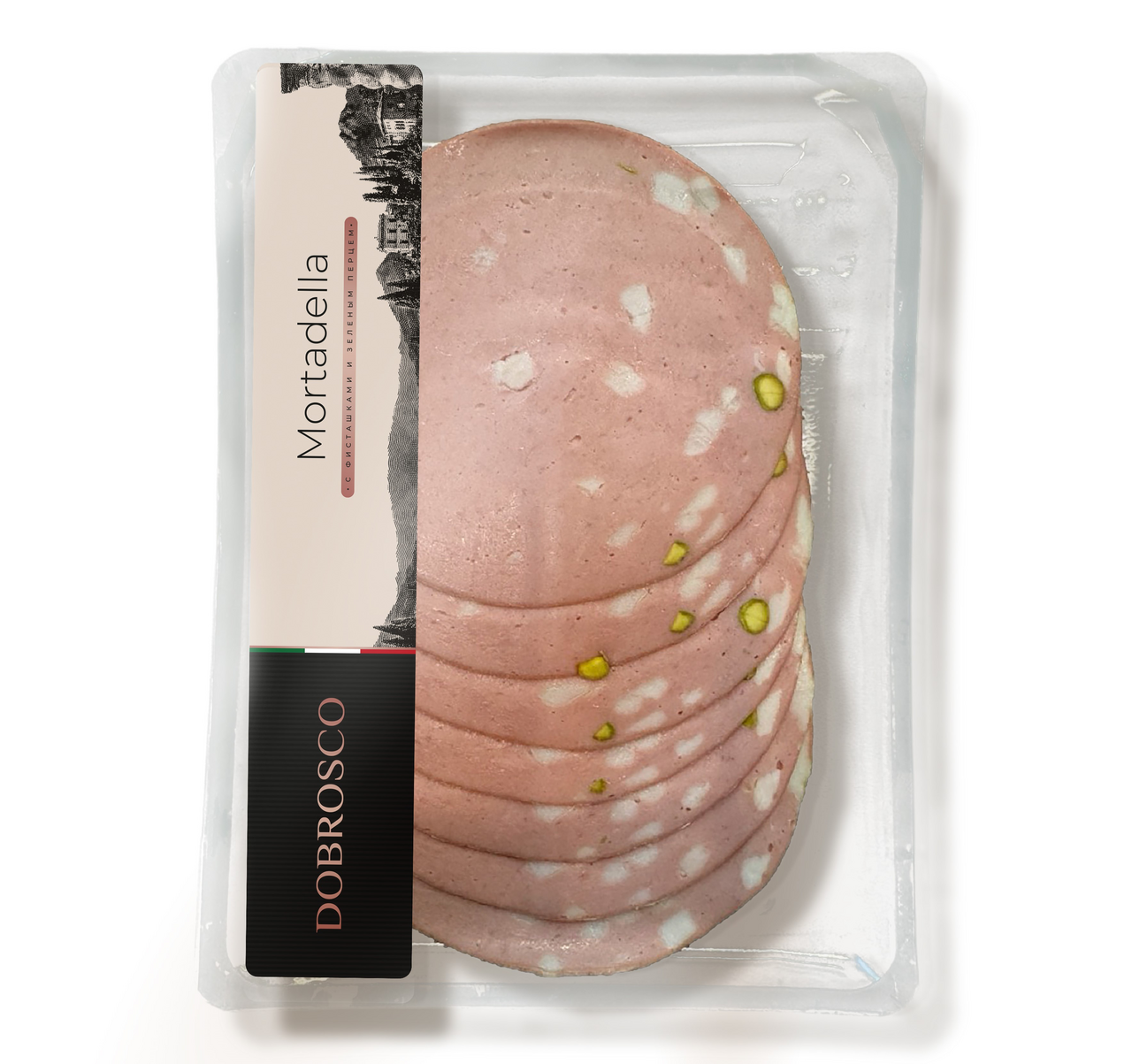 Это итальянская варёная колбаса, происходящая из Болоньи, регион Эмилия-Романья. Она имеет нежный вкус без примеси копчения, а вкрапления зелёного перца и фисташек добавляют пикантности. Аутентичный состав исключает наличие воды, крахмалла или соевого белка в настоящей Мортаделле от Dobrosco.