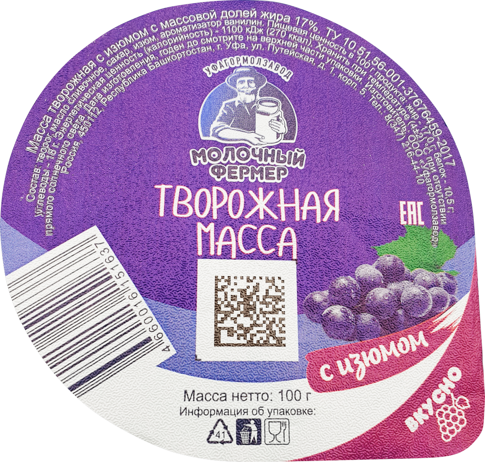 Масса творожная Молочный фермер с изюмом 17%, 100г