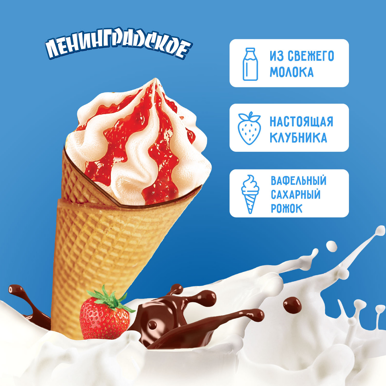 Мороженое рожок Ленинградское сливочное ванильное с клубничным наполнителем. Классическое сочетание сливочного вкуса и клубничного наполнителя. Хрустящий рожок с шоколадным впрыском. Натуральный состав.