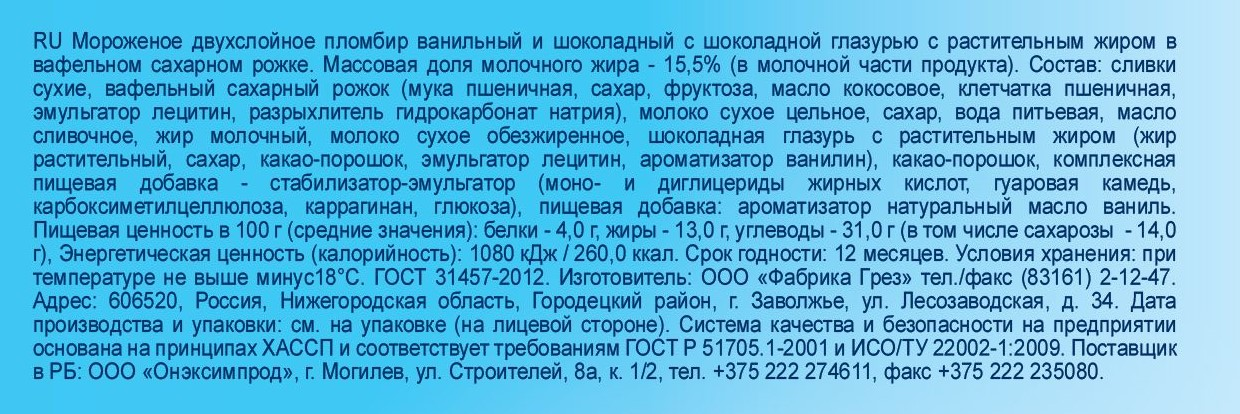 Сливки сухие, вафельный сахарный рожок (мука пшеничная, сахар, фруктоза, масло кокосовое, клетчатка пшеничная, эмульгатор лецитин, разрыхлитель гидрокарбонат натрия), молоко сухое цельное, сахар, вода питьевая, масло сливочное, жир молочный, молоко сухое обезжиренное, шоколадная глазурь с растительным жиром (жир растительный, сахар, какао-порошок, эмульгатор лецитин , ароматизатор ванилин), какао-порошок, комплексная пищевая добавка - стабилизатор-эмульгатор (моно- и диглицериды жирных кислот, гуаровая камедь, карбоксиметилцеллюлоза, каррагинан, глэкоза), пищевая добавка: ароматизатор натуральный масло ваниль.