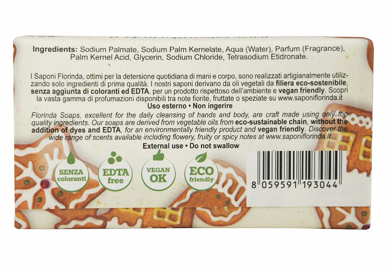 Этот продукт не только очищает всю поверхность кожи, но и бережно питает ее набором полезных микрокомпонентов и витаминов. Регулярное использование этого мыла позволит нормализовать содержание витаминов, кислот и минералов вашей коже. Косметический продукт рекомендован к ежедневному применению, так как он помогает локализовать и устранить самые первые признаки старения кожи, взамен питая ее и восстанавливая структуру кожного покрова. Мыло на 100% натуральное и не содержит каких-либо вредных синтетических ингредиентов в своем составе. Подходит для кожи любого типа и не имеет противопоказаний. Благодаря высокому содержанию в составе парфюмерной композиции, мыло обладает восхитительно теплым ароматом имбирного печенья. Оно станет приятным презентом к Новогодним праздникам.
