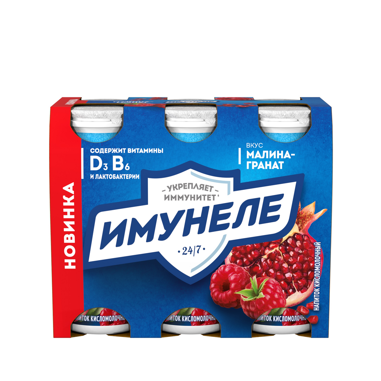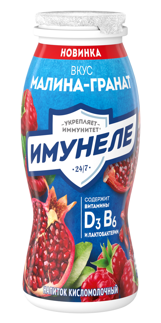 Вкусный и полезный кисломолочный напиток со вкусом сладкой малины и сочного граната. Напиток способствует укреплению иммунитета благодаря комплексу витаминов и лактобактерий. Ежедневное употребление 2х бутылочек Имунеле способствует снижению числа случаев возникновения инфекций дыхательных путей, сокращению длительности течения заболевания и снижению выраженности симптомов болезни. Эффективность доказана клиническими исследованиями. Пробиотик L.Casei нормализует микрофлору кишечника и защищает ее от микробов. L.Rhamnosus дополняет его действие, укрепляя иммунитет. Витамины E и D3 помогают организму сопротивляться инфекциям и препятствуют старению иммунной системы. Цинк противостоит простудам, а йод придает сил. Институт питания РАМН рекомендует Имунеле для ежедневного применения, особенно в холодное время года.