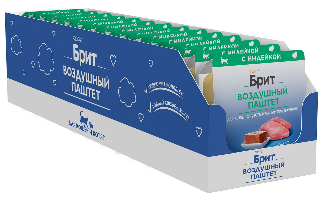 Полнорационный консервированный корм премиум класса с индейкой для взрослых кошек с чувствительным пищеварением. Технология производства воздушных паштетов — аэрация. Аэрация означает насыщение воздухом. Воздушные паштеты — высокотехнологичный продукт, который производится в специальном аппарате — паштетном эмульситаторе. Сырье одновременно измельчается, смешивается и взбивается, приобретая легкую, воздушную консистенцию. Упаковано в ламистер – алюминиевую упаковку нового поколения, что означает герметичность, безопасность и легкость открывания, легкий вес.