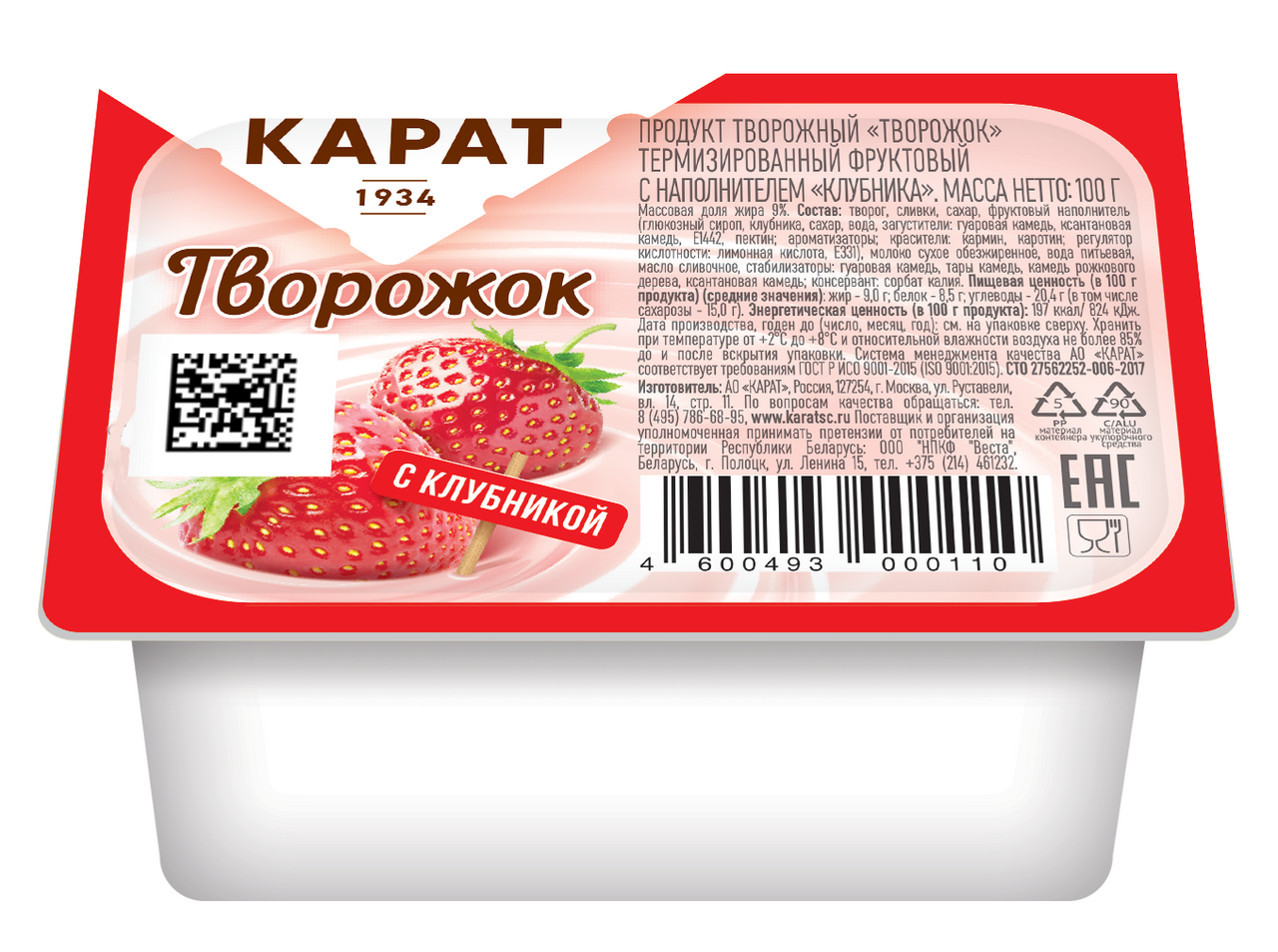 Сделан из натурального творога с добавлением сливок и ягодного наполнителя. У него нежная текстура и яркий, натуральный ягодный вкус. Творожок произведен из натурального творога с добавлением сливок и фруктово-ягодных наполнителей. Нежная текстура, достигаемая за счет интенсивного перемешивания, дополнена вкусом клубники.