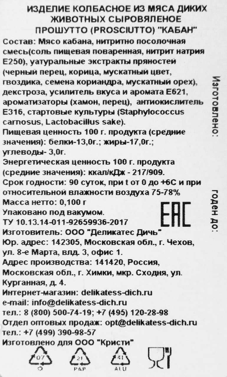 Мясо кабан, нитритно посолочная смесь(соль пищевая поваренная, нитрит натрия Е250), пряности молотые (горчица, перец черный, кориандр, имбирь) , ароматизаторы (перец черный), декстроза, усилитель вкуса и аромата Е621, стартовые культуры (Staphylococcus carnosus, Lactobacillus sake).