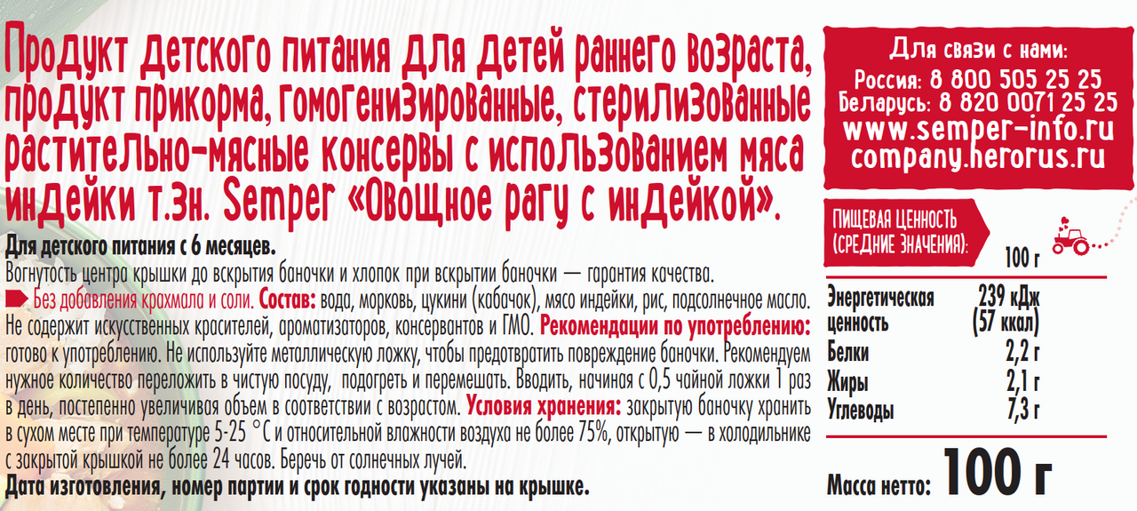 Пюре детское Semper Рагу овощное с индейкой, 100г