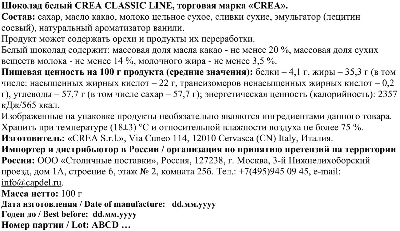 Шоколад Crea - это плиточный шоколад снежной кремовой текстурой. Погрузитесь вмир изысканного вкуса сшоколадом Crea, изготовленным излучших какао-бобов. Этот шоколад отличается не только невероятным вкусом, но иароматом натурального качественного шоколада. Подарите себе исвоим близким моменты истинного наслаждения сшоколадом, который сочетает всебе традиции истрасть ккачеству. В отличие от других видов в состав белого шоколада добавляется только какао-масло без какао тертого, благодаря чему белый шоколад имеет такой нежный сливочный цвет.