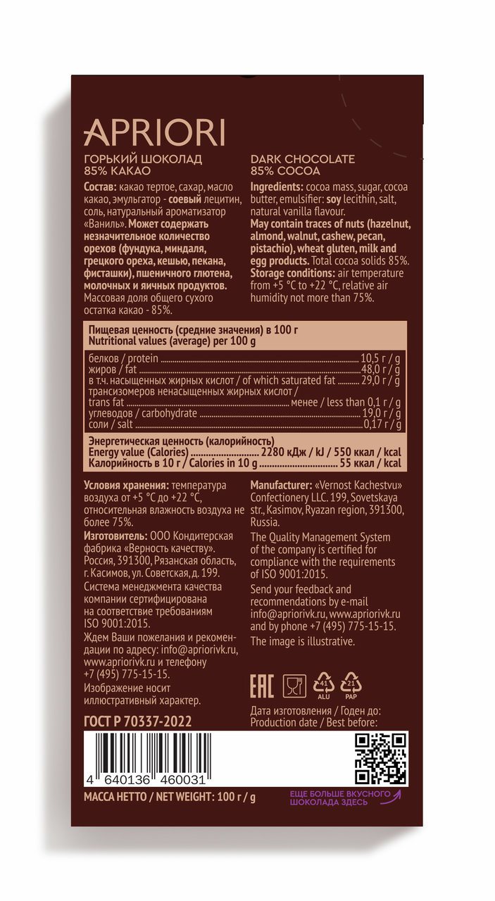 Горький шоколад с высоким содержанием какао. Благородный, терпкий и глубокий вкус для ценителей. Шоколад создан по собственной уникальной рецептуре. Это российский шоколад высокого качества. Чистый состав, без эквивалентов какао-масла.
