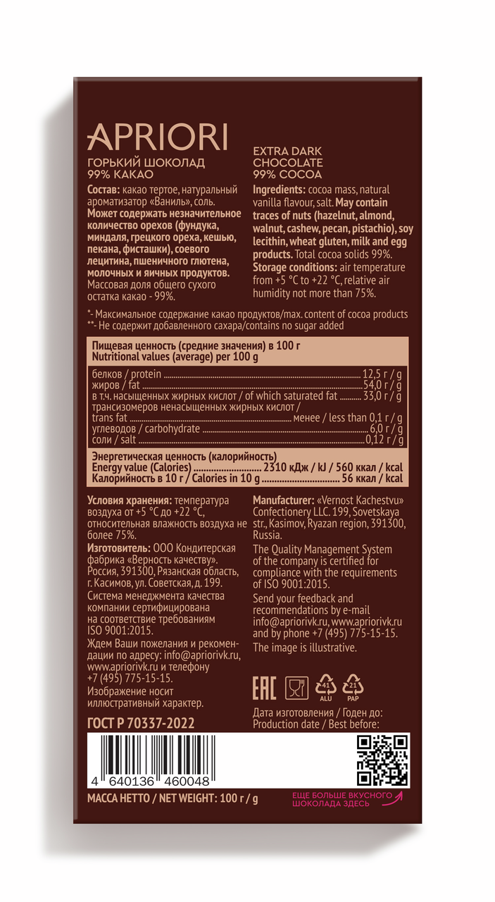 Экстра горький шоколад без сахара. Яркий, насыщенный вкус какао бобов с легким оттенком ванили. Шоколад создан по собственной уникальной рецептуре. Это российский шоколад высокого качества. Чистый состав, без эквивалентов какао-масла.