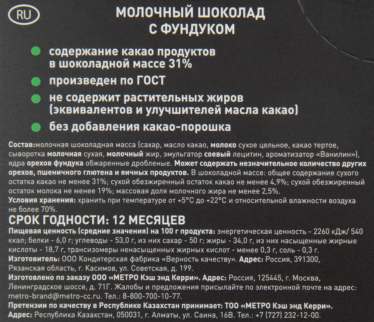Молочный шоколад с цельными лесными орехами. Гармоничное сочетание нежного мягкого шоколада и фундука порадует самых взыскательных любителей сладости вне зависимости от их возраста. Десерт привлекательно выглядит, аппетитно пахнет и радует приятным вкусом. Его можно есть сам по себе, также он отлично подходит к чаю или кофе. Шоколад подкрепляет силы во время долгого дня на работе или в школе, его можно взять с собой в поездку.