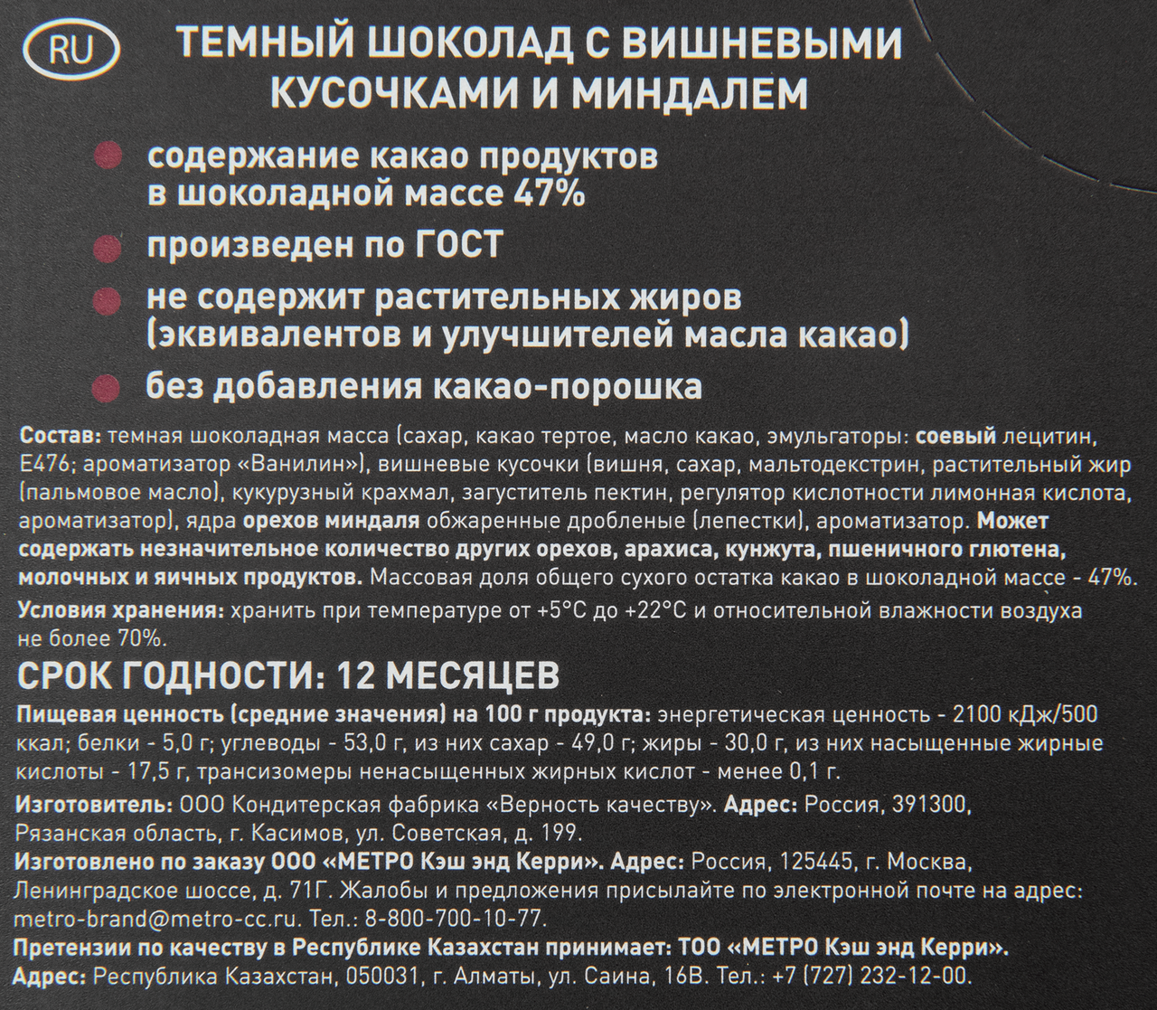 Темная шоколадная масса (сахар, какао тертое, масло какао, эмульгаторы: соевый лецитин, Е476; ароматизатор Ванилин), вишневые кусочки (вишня, сахар, мальтодекстрин, растительный жир (пальмовое масло), кукурузный крахмал, загуститель пектин, регулятор кислотности лимонная кислота, ароматизатор), ядра орехов миндаля обжаренные дробленые (лепестки), ароматизатор. Может содержать незначительное количество других орехов, арахиса, кунжута, пшеничного глютена, молочных и яичных продуктов. Массовая доля общего сухого остатка какао 47% в шоколадной массе.
