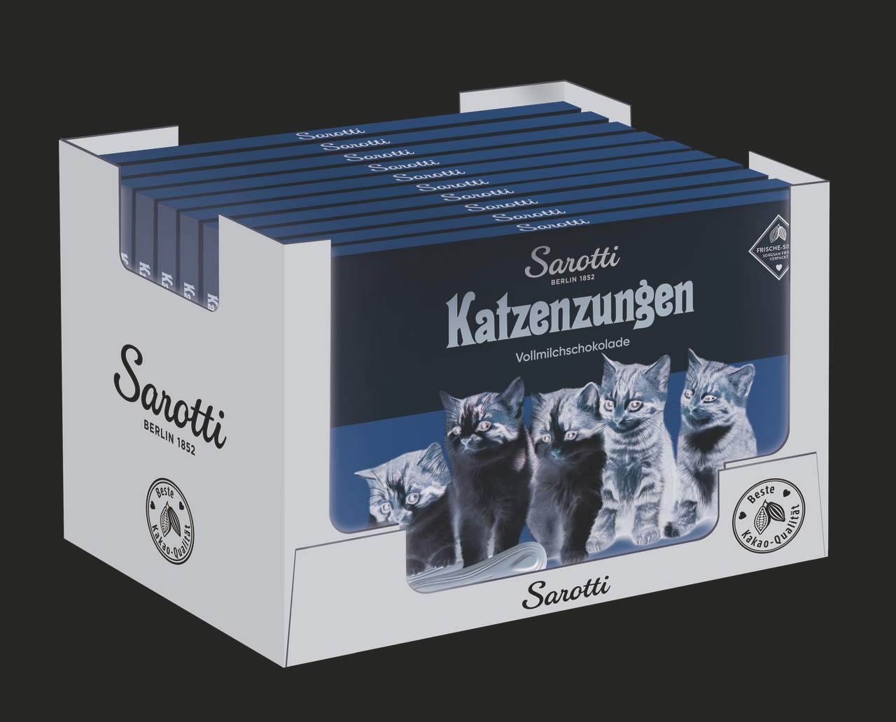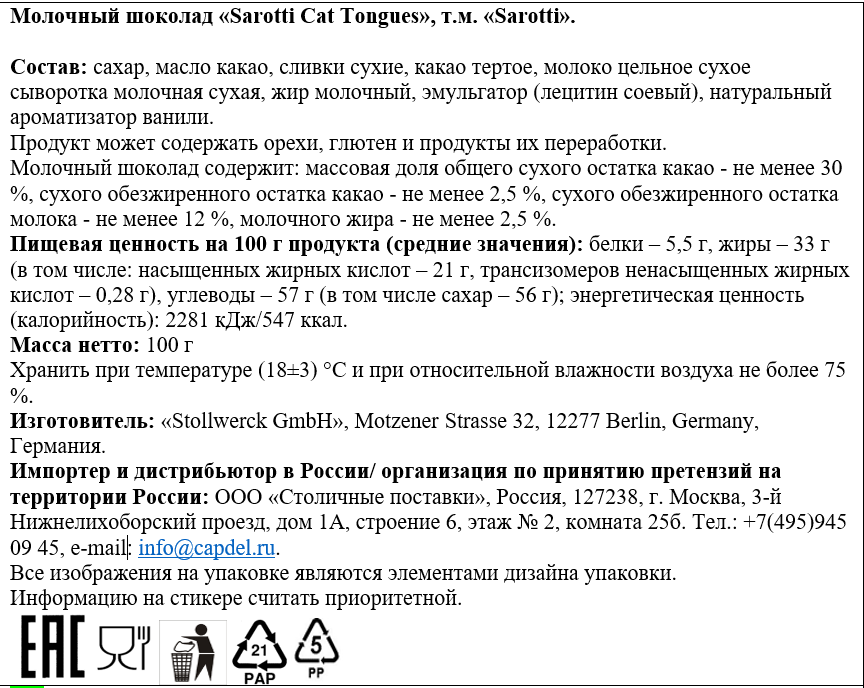 Настоящий немецкий молочный шоколад, сделанный на фабрике шоколада с более, чем вековой историей. Кошачьи язычки Sarotti изготавливаются из высококачественного молочного шоколада с отборным какао. Внутри коробки находится 20 порций шоколада в форме кошачьих язычков.