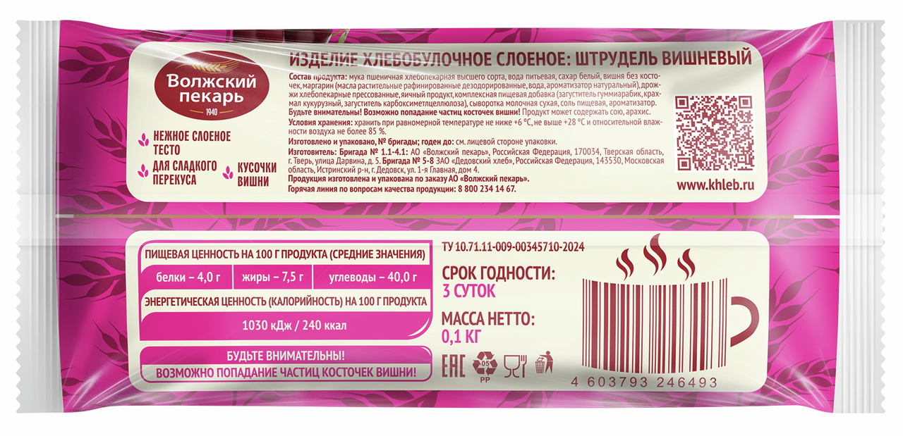 Мука пшеничная хлебопекарная высшего сорта, вода питьевая, сахар, вишня без косточек, маргарин рафинированные дезодорированные растительные масла пальмовое, модифицированное пальмовое, вода, эмульгаторы эфиры моно - и диглицеридов лимонной и жирных кислот, эфиры полиглицеридов и жирных кислот, соль, консерванты сорбиновая кислота, бензоат натрия, краситель каротин, ароматизатор, регулятор кислотности лимонная кислота, дрожжи хлебопекарные прессованные, яичный продукт, пищевая добавка: загуститель дикрахмаладипат ацетилированный, сыворотка молочная сухая, соль, комплексная пищевая добавка – улучшитель мука пшеничная, мука соевая, ферменты микробного происхождения: альфа-Амилаза, ксиланаза, антиокислитель: аскорбиновая кислота, ароматизатор.