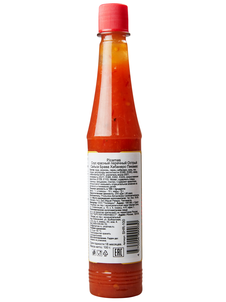 Перец Хабанеро, морковь, вода, соль, лук, специи, сахар, регулятор кислотности (Е260, Е330), усилитель вкуса Е621, консерванты (Е211, Е385, Е202, Е223), искусственные красители Е129, Е110).