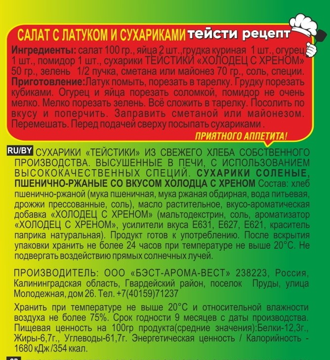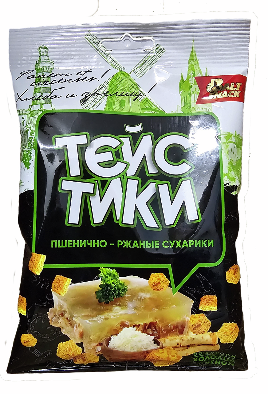 Сухарики Тейстики произведены в Калининградской области из хлеба собственного производства. Для производства хлеба берутся только натуральные ингредиенты: мука пшеничная 1 сорт, мука ржаная обдирная, вода питьевая, живые дрожжи, соль. Для придания вкуса и аромата продукции используются лучшие специи и ароматические добавки. Сухарики отлично подойдут для легкого и полезного перекуса. Продукцию можно использовать как дополнительный ингредиент в кулинарных изделиях: овощных и мясных салатах, супах и бульонах.Это вкусный перекус, у которого сочный мясной вкус смешан с легкой остротой хрена. Сухарики изготавливаются из высококачественной ржано-пшеничной муки и содержат натуральные ингредиенты, которые помогают имитировать вкус холодца с хреном.
