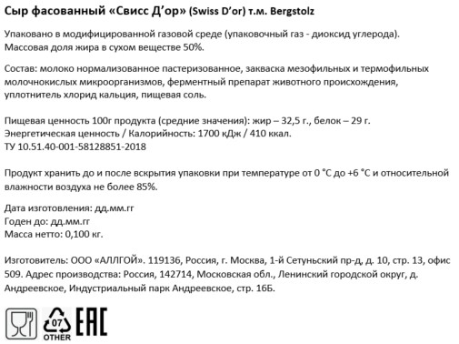 Сыр Bergstolz Swiss D'Or твердый 52%, 100г