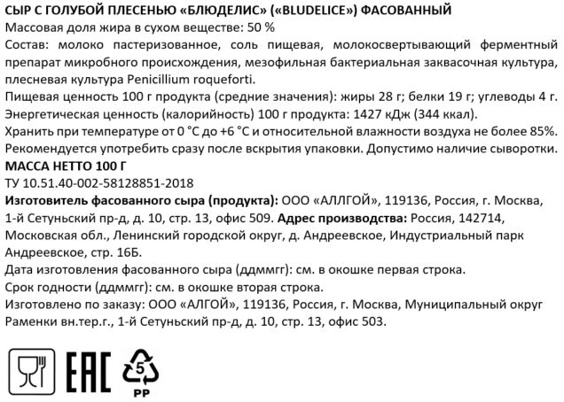 Молоко пастеризованное, соль пищевая (содержит агент антислеживающий Е536), уплотнитель хлорид кальция, молокосвертывающий ферментный препарат микробного происхождения, мезофильная бактериальная заквасочная культура, плесневая культура Penicillium roqueforti.