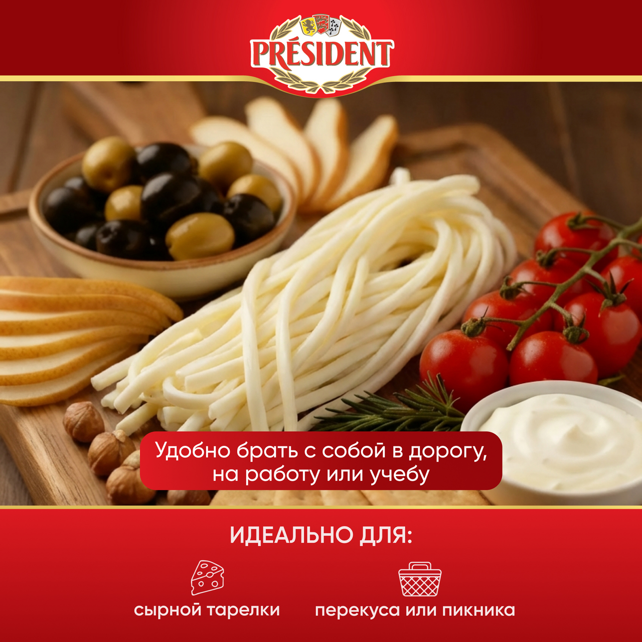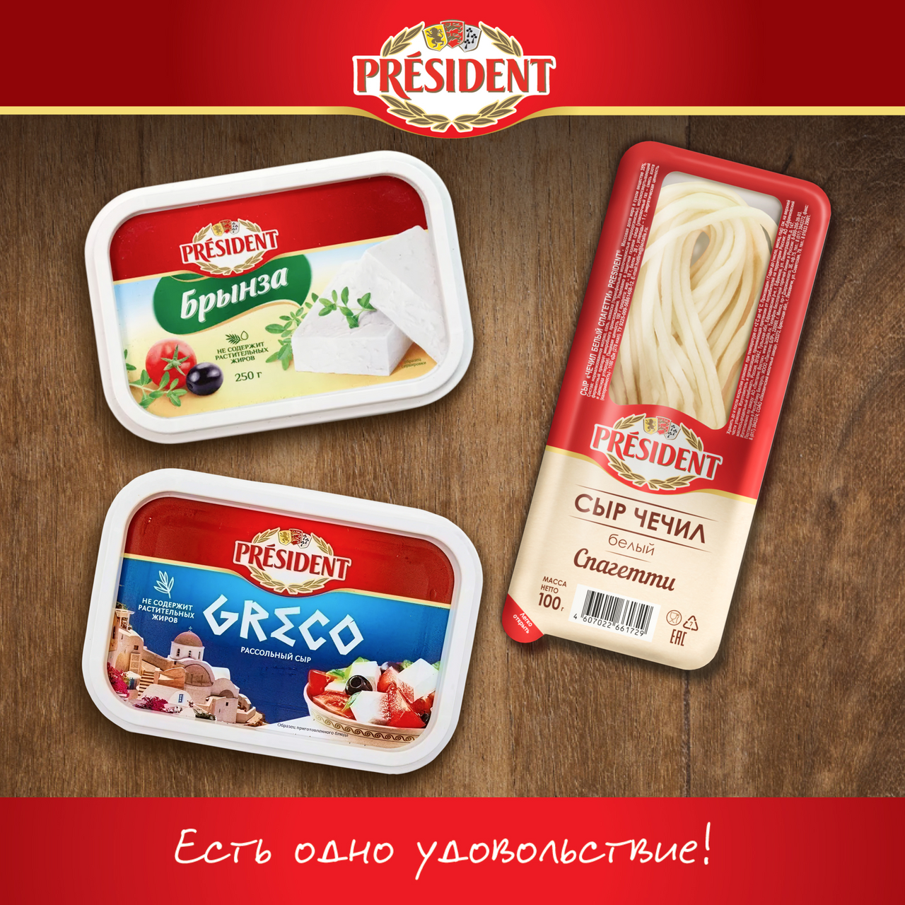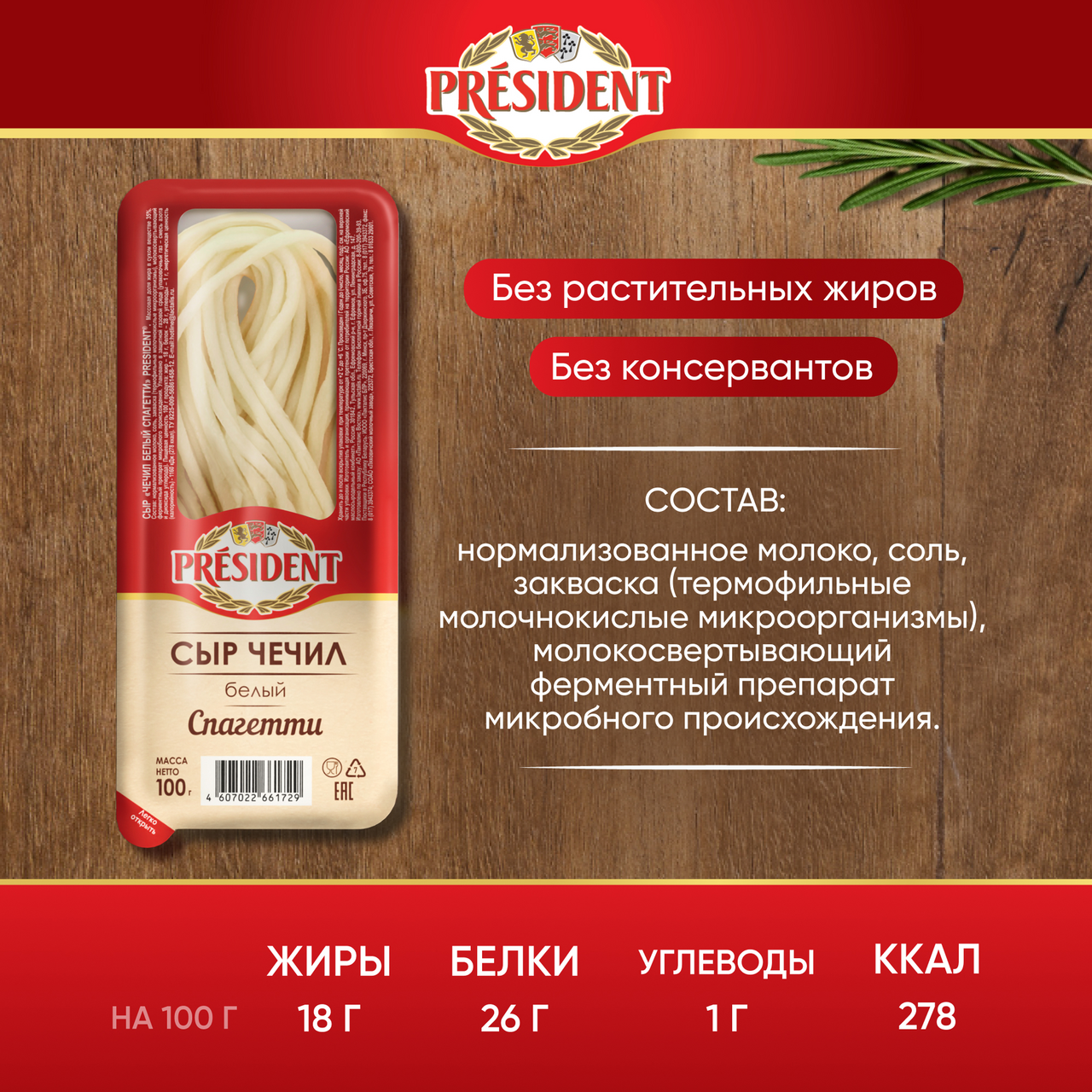 Сыр Чечил President - это натуральный сыр, с эластичной волокнистой текстурой, который обладает неповторимым соленым вкусом и может служить превосходным перекусом. Чечил хорошо подходит в качестве независимой закуски, например, в дороге. Вкус этого сыра самодостаточен, его можно не совмещать с другими продуктами, тем не менее он отлично сочетается со свежими овощами и хлебом. Полутвёрдый сорт, который обладает плотной текстурой с абсолютным отсутствием глазков, а также немного резким и кисловатым ореховым вкусом. У него приятный золотисто-красный оттенок. Нередко Чеддер применяют при приготовлении различных омлетов, салатов, сырных бисквитов, канапе, гамбургеров и других блюд. Из этого сыра получается аппетитный соус, который выступит удачным дополнением к рыбе, мясу, картофелю и тостам.