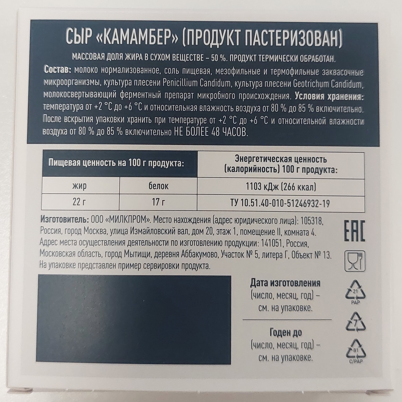 Молоко нормализованное, соль пищевая, мезофильные и термофильные заквасочные микроорганизмы, культура плесени Penicillium Candidum, культура плесени Geotrichum Candidum, молокосвертывающий ферментный препарат микробного происхождения.