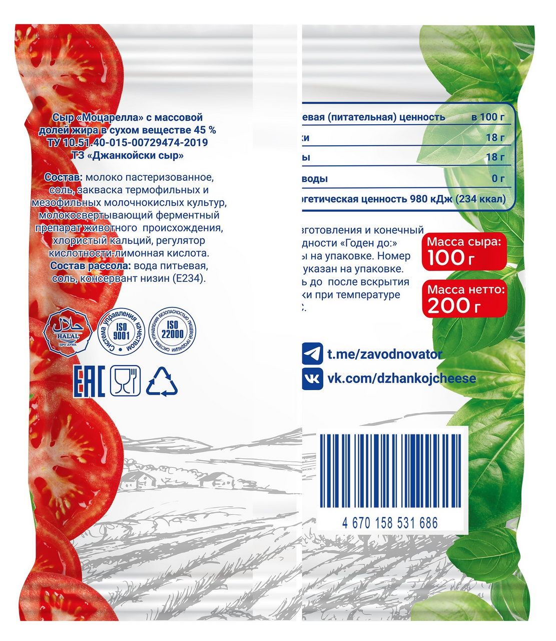 Сыр Джанкойский Моцарелла 45% 1 шарик, 100г БЗМЖ обладает нежным сырным вкусом и ароматом с легкой кислинкой. Консистенция пластичная, имеет светлый цвет. В кулинарии этот продукт – незаменимый компонент для основных блюд и десертов, а также для украшения сырной тарелки.
