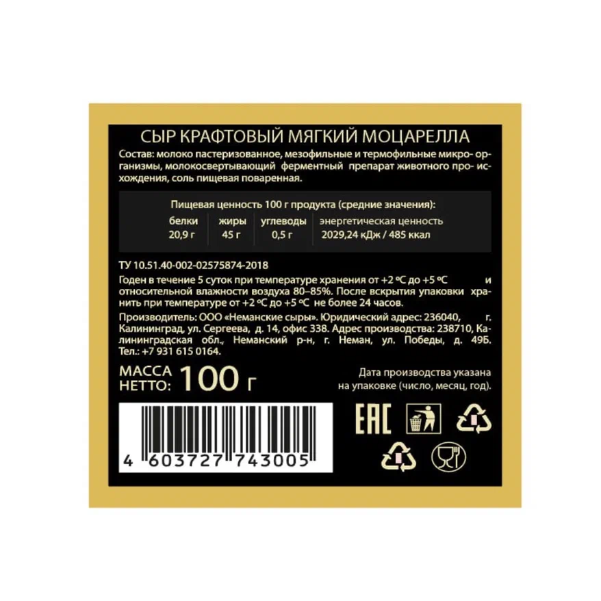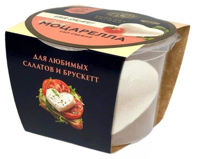 Мягкий сыр, приготовленный по классической итальянской рецептуре из свежего молока. Он делается в форме небольших шариков и поставляется в специальном рассоле. Моцарелла обладает очень нежным, нейтральным и даже немного пресным вкусом и упругой, слегка слоистой, пористой текстурой. Если слегка надавить на шарик, то можно увидеть на сырном теле капельки сыворотки. Моцарелла является незаменимым ингредиентом знаменитого салата Капрезе, прекрасно подходит для добавления в закуски, запеканки, лазанью, выпечку, соусы, блюда из овощей.