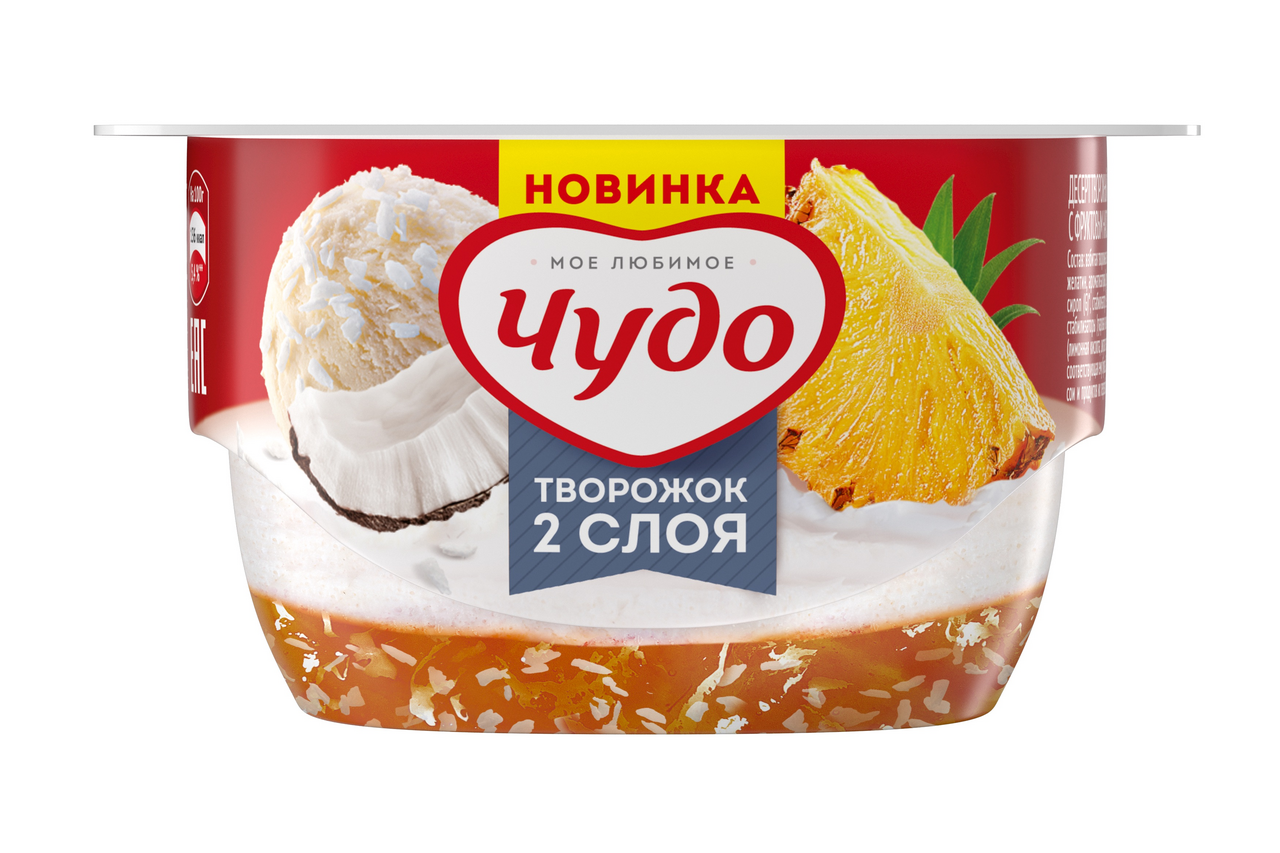 Взбитая творожная основа творог, сливки, йогурт, сахар, стабилизаторы E1422, гуаровая камедь, тары камедь, желатин, ароматизаторы, фруктовый наполнитель Тропические фрукты ананас, вода, сахар, глюкозно-фруктозный сироп G*, стабилизатор Е1442 Н* или стабилизатор Е1422 Т* или кукурузный крахмал Х*, стружка кокосовая, стабилизаторы гуаровая камедь, ксантановая камедь, камедь рожкового дерева, ароматизатор, регуляторы кислотности лимонная кислота, цитрат натрия 3-замещенный. *- при использовании данного компонента в маркировке указывается соответствующая ему буква. продукт может содержать незначительное количество глютена, а также арахиса, орехов, яиц, сои и продуктов их переработки.