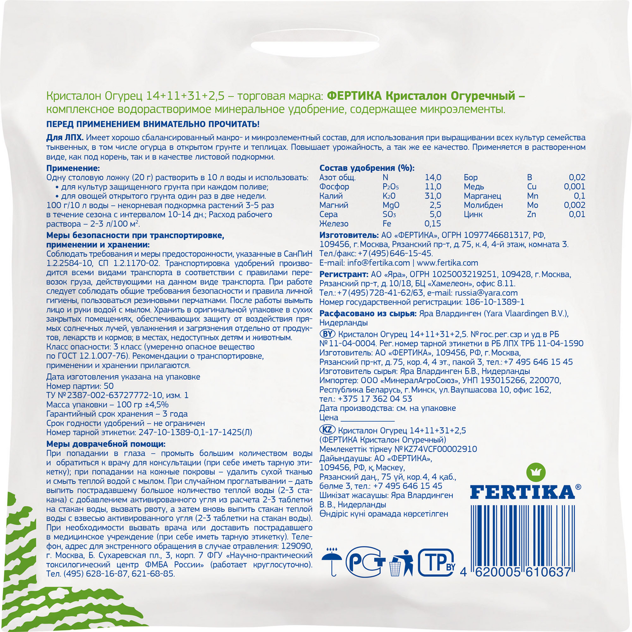 Полностью водорастворимое комплексное азотно-фосфорнокалийное удобрение, содержащее микроэлементы. Особенности:- Имеет хорошо сбалансированный макро- и микроэлементный состав для использования при выращивании всех культур семейства тыквенных, в том числе огурца в открытом грунте и теплицах;- Повышает урожайность, а также качество плодов;- Применяется в виде водного раствора, как под корень, так и в качестве листовой подкормки в течение периода вегетации растений.