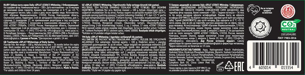 Мультиактивная зубная паста Mint oil+ lemon oil Whitening. Эффективное очищение. Мятное освежение. Осветление эмали. Содержит: Эфирные масла лимона и мяты перечной. Натуральные эфирные масла лимона и мяты перечной мультиактивной зубной пасты splat daily whitening обеспечивают свежесть дыхания. Эфирное масло мяты перечной. Эфирное масло мяты перечной проявляет антибактериальное действие, способствует снижению кровоточивости десен, освежает полость рта, обладает антисептическим действием. Папаин и пирофосфаты. Папаин и пирофосфаты способствуют уменьшению зубного налета.