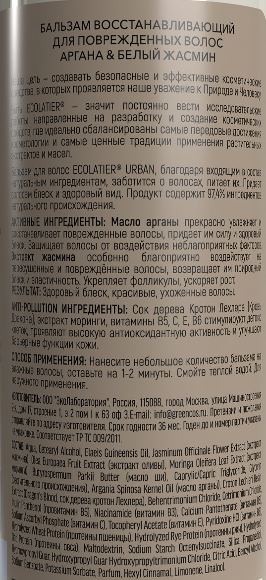 Вода, цетеариловый спирт, масло elaeis guineensis, экстракт цветков жасмина лекарственного (экстракт жасмина), экстракт плодов olea europaea (экстракт оливы), экстракт листьев moringa oleifera (экстракт моринги), масло butyrospermum parkii (масло ши), каприловый/каприновый триглицерид, глицерин (растительного происхождения), масло ядра argania spinosa (масло арганы), экстракт смолы croton lechleri (dragon's blood, сок дерева кротон лехлера), behentrimonium chloride, cetrimonium chloride, инулин, пантенол (провитамин в5), ниацинамид (витамин в3), пантотенат кальция (витамин в5), аскорбилфосфат натрия (витамин с), токоферола ацетат (витамин е), пиридоксина hcl (витамин в6), гидролизованный протеин пшеницы (протеины пшеницы), гидролизованный протеин ржи (протеины ржи), гидролизованный протеин овса (протеины овса), мальтодекстрин, октенилсукцинат натрия, диоксид кремния, пропандиол, гидроксипропилгуар, гидроксипропилгуар, хлорид гидроксипропилтримония, лимонная кислота, бензиловый спирт, бензоат натрия, сорбат калия, отдушка, гексилциннамал, лимонен, линалоол.