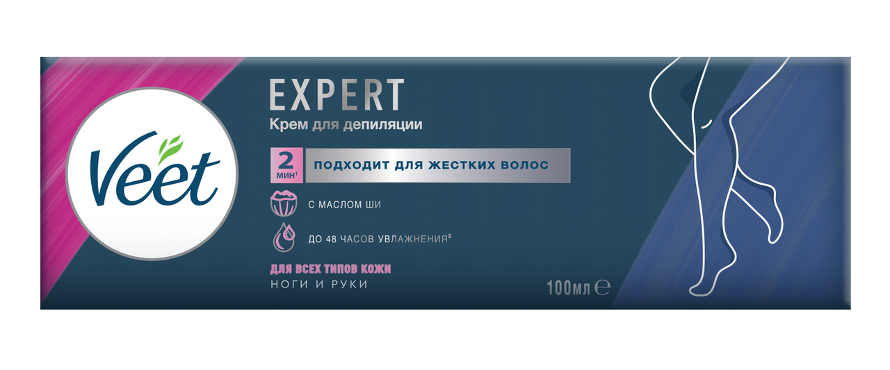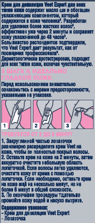 Крем для депиляции Veet Expert содержит масло ши и обогащен увлажняющим компонентом карбомидом, который содержится в коже человека. Разработан для удаления более жестких волос, эффективен уже от 2 минут и сохраняет кожу увлажненной до 48 часов Большинство респондентов подтвердили, что Veet Expert дает результат, как от посещения профессионала. Дерматологически протестирован; подходит для всех типов кожи, включая чувствительную.