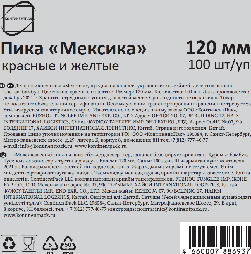 Пики Континентпак Мексика бамбуковые красные и желтые 12см, 100шт